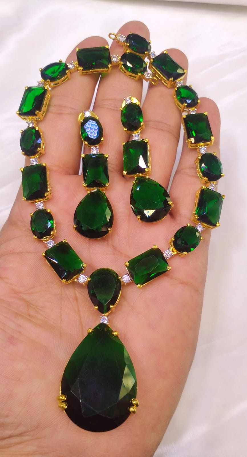 Make a bold and elegant statement with our stunning Emerald Green Gold Polished Jewelry Set. Designed for women who love luxury and sophistication, this set features a beautiful emerald green stone design paired with a rich gold-polished finish.
