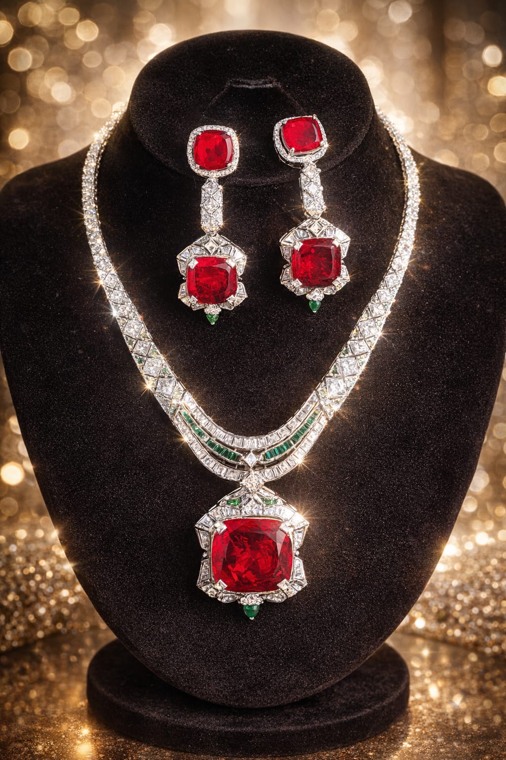 The intricate geometric detailing adds a modern touch while maintaining a classic and regal feel. At the center, a stunning ruby-red stone pendant becomes the focal point, offering a rich and luxurious appeal.